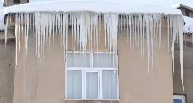 Hakkâri’nin Yüksekova ilçesindeki evlerin çatıları, yer yer bir metreyi bulan buz sarkıtlarıyla kaplandı.