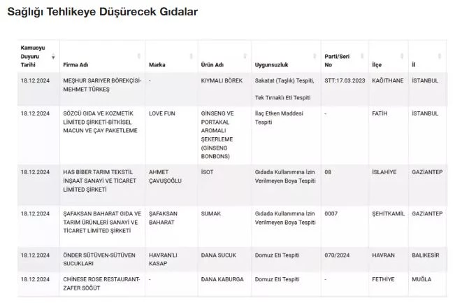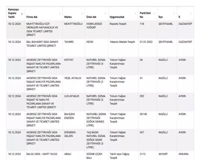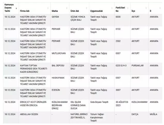 Tarım ve Orman Bakanlığı taklit, tağşiş ve sağlığı tehlikeye düşürecek gıdaları üretenleri ifşa ediyor. Bakanlık tarafından yapılan ve 12 gündür açıklanmayan listeye yeni ürünler ve markalar dahil oldu. Bazı markaların sattığı sucuklarda domuz eti çıktı. Kıymadan bala, zeytinyağından kekiğe kadar birçok üründe sahtecilik tespit edildi.