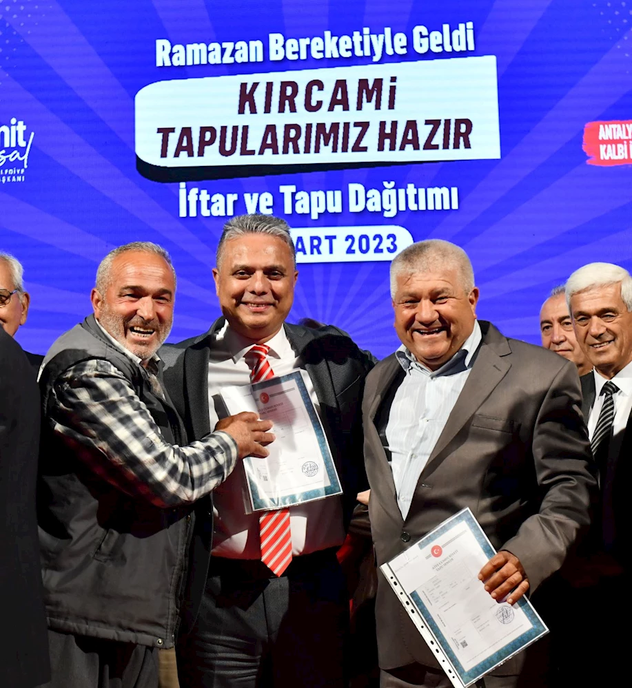 Muratpaşa’da ilk iftar dualar eşliğinde açılırken Başkan Uysal, düzenlenen tapu dağıtım töreninde Kırcamililere “Beraber, omuz omuza mücadele ettiğimiz, Kırcami’mizin imar planımızın da tapu aşamasındayız. Ruhsat aşamasındayız. Çap aşamasındayız. Nihayetindeyiz. Hepimize hayırlı olsun, kutlu olsun” diye seslendi.
