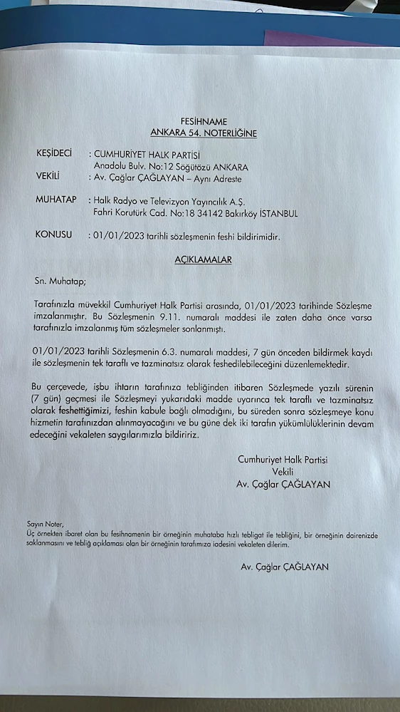 CHP’nin Halk TV ile olan sözleşmesinin canlı yayın aracı ve canlı yayınlar için hizmet alımı olduğu öğrenildi. CHP, dün HalkTV ile sözleşmesini feshettiğini duyurdu. CHP Genel Başkan Yardımcısı Eren Erdem tarafından yapılan açıklamada 'Halk TV isimli televizyon kanalı ile partimiz arasında yapılmış olan ve Anayasa Mahkemesi ve Sayıştay denetimine tabi; 01.01.2023 tarihli protokolün 6.3. maddesi kapsamında, partimiz tek taraflı fesih hakkını kullanmış, Halk TV ile tüm ilişkimiz sona ermiştir' denildi.