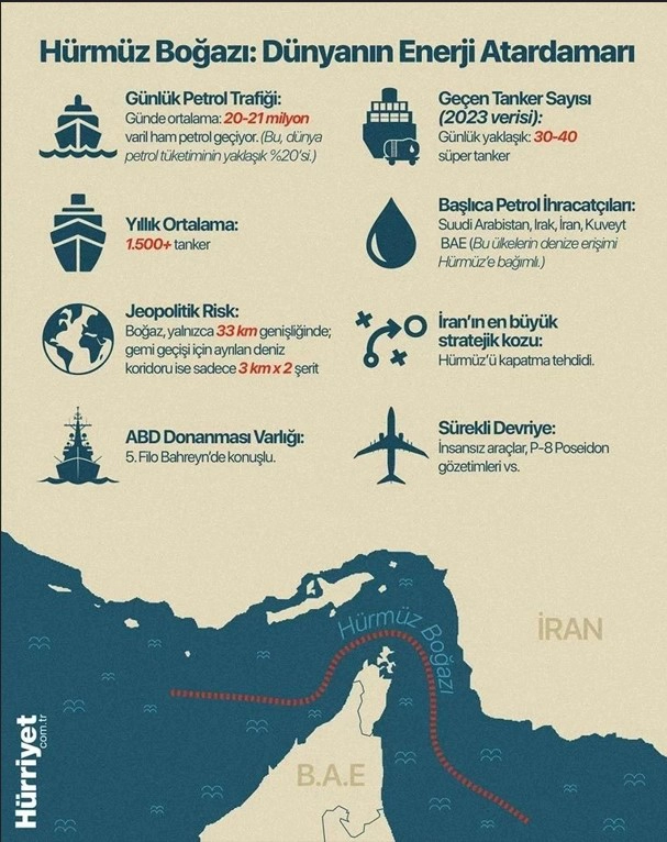 Selçuk Esenyel: Hürmüz Boğazı, dünya enerji ticaretinin kalp kapakçığıdır. Basra Körfezi’ni Umman Körfezi’ne bağlayan bu dar geçit, günlük ortalama 20 milyon varille küresel petrol ticaretinin yaklaşık dörtte birinin, LNG (sıvılaştırılmış doğal gaz) ticaretinin ise yaklaşık beşte birinin geçtiği bir koridordur. Örneğin Çin’in ithal ettiği petrolün yüzde 45’i Hürmüz Boğazı’ndan geçiyor.