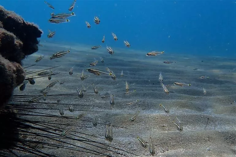 Keşif dalışında karşılaştıkları ikinci türle ilgili de bilgi veren Ayas, 'İzlediğimiz tür 10 yıl önce sularımıza yine Kızıldeniz'den gelen Parupeneus forsskali dediğimiz sivri burun barbun. Bu tür bizim pilot alanımızda bir yıldır izlediğimiz bir tür. Bu türün aslında biz yerli barbun türleriyle besinsel bir rekabet ilişkisine girdiğini görüyoruz. Deniz tabanında bulunan makro zoolantik canlılarla besleniyor. Hem yeni yabancı tür sivri burun barbun hem de yerli barbunlarımız aynı besin tipiyle besleniyorlar. Tabi sonuçta besine ortak olarak yerli barbun türlerinin popülasyonlarını daraltıyor.'