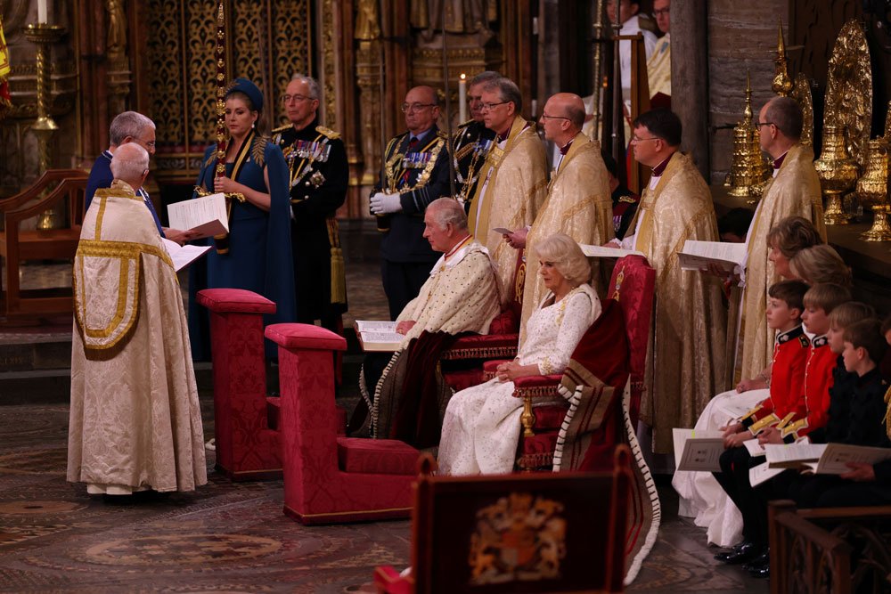 Töreni yöneten Canterbury Başpiskoposu Justin Welby ve bazı lordlar, kralı tanıdıklarını deklare eden konuşmalarını yaparken İncil takdim edilen kral, hükümdar yemini etti.