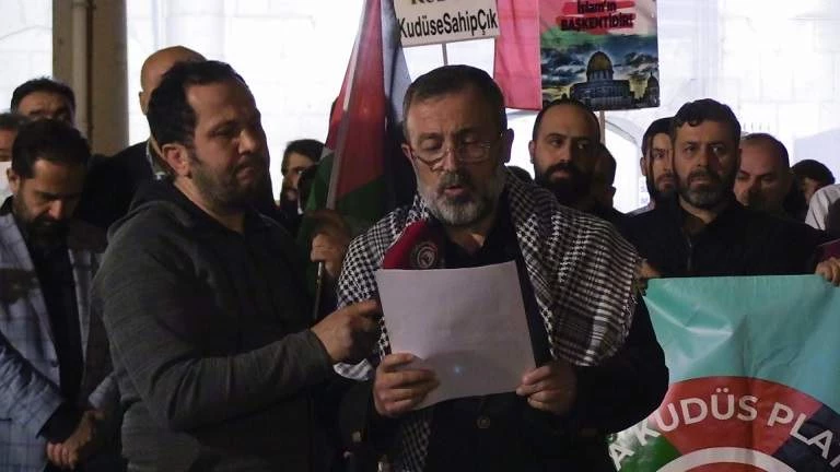 Yıldırım, “Kudüs özgür olana dek mücadelemize devam edeceğiz. Biliyoruz ki işgalci siyonistler Filistin’den çıkarılmadan coğrafyamız rahat yüzü görmeyecek.” diye konuştu. Gruptakiler, basın açıklamasının ardından Kudüs’ün özgürlüğü için dua etti. /MEDİHABER