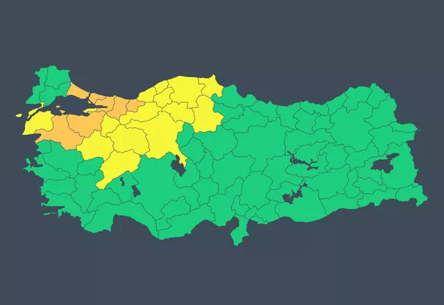 İstanbul, Kocaeli, Sakarya, Düzce, Balıkesir, Bursa için turuncu, Çanakkale, Yalova, Bilecik, Kütahya, Afyonkarahisar, Eskişehir, Ankara, Bolu, Karabük, Zonguldak, Bartın, Çankırı, Çorum, Kastamonu ve Sinop için sarı uyarı yapıldı.