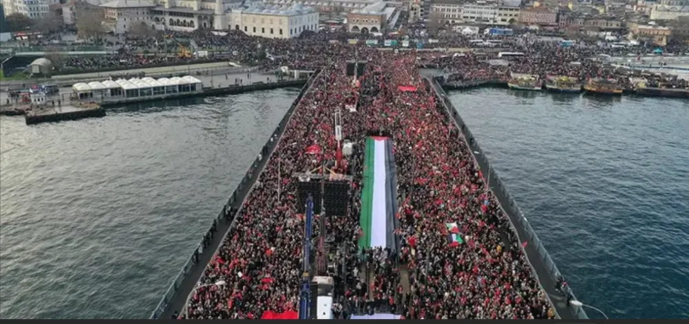 İnsanlık İttifakı ve Milli İrade Platformunca, Filistin'deki katliamın durdurulması amacıyla 400'den fazla sivil toplum kuruluşunun iştirakiyle düzenlenen "Sinmiyoruz, susmuyoruz, Filistin'i unutmuyoruz" mitingi için sabah namazında camilerde bir araya gelen on binlerce katılımcı, kortejlerle Galata Köprüsü'ne doğru yürüyüşe başladı.