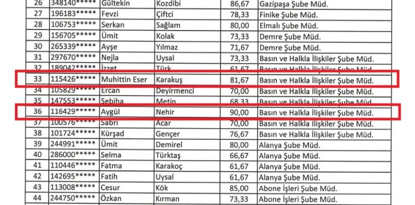 Toplam 14 şube müdürlüğü kadrosu açılan sınava başvuranlar arasında 45 aday yazılı sınavda başarılı bulunarak sözlü sınava alındı. Yazılıda yüksek puan almasına karşın sözlüde düşük puan alarak ‘başarısız’ bulunan aday sayısı 37 oldu. Yazılıda 85 puan alan C.K, sözlüde 61,4 puan alarak elendi. M.K de yazılıda 81,67 almasına karşı sözlüde 65,6 puanla elenen isimler arasında. Yazılıda 86,67 puan alan G.K ise sözlüde 60 puan alarak elenen isimler arasında yer aldı. Açılan 14 şube müdürlüğü için 8 kadroya atama yapıldı. Yazılıda başarılı olan adaylar olmasına karşın sözlü sınavda elenenlerle 6 şube müdürlüğü kadrosu boş kaldı.