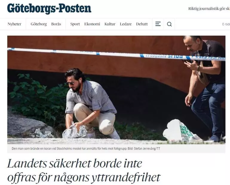 İsveç'in başkenti Stockhlom’de bir caminin önünde Kur’an-ı Kerim yakma eylemine izin veren İsveç'e tepkiler çığ gibi büyürken bugün, bugün İsveç basınında dikkat çeken ifadeler yer aldı. Kur'an-ı Kerim yakan provokatör Salwan Momika ise Expressen'e konuştu ve 10 gün içinde Irak'ın Stockholm'deki büyükelçiliği önünde Kur'an-ı Kerim yakacağını duyurdu.