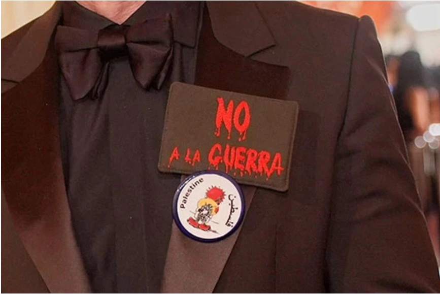 Bardem'in yakasındaki İspanyolca 'Savaşa Hayır' ve 'Filistin' yazan iki rozet de dikkatlerden kaçmadı.