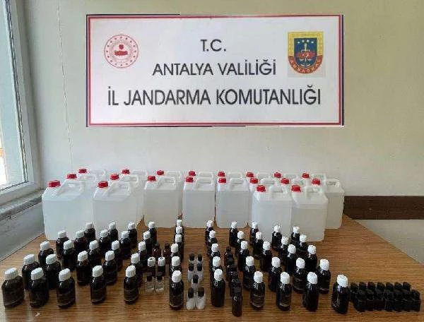 Antalya'nın Kemer ilçesinde jandarmanın düzenlediği operasyonda 105 litre etil alkol, 57 malt aroması, 16 viski aroması, 4 gliserin, 9 anason ve 15 kokteyl aroması ele geçirildi.