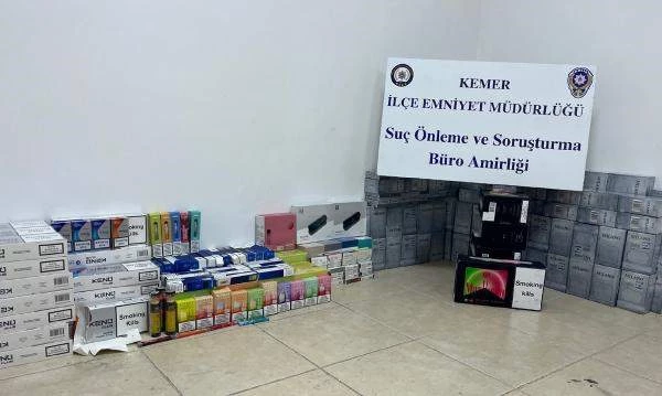 Kemer Cumhuriyet Başsavcılığı koordinesinde, Kemer İlçe Emniyet Müdürlüğü ekipleri, Yeni Mahalle Dörtyol Bulvarı üzerindeki bir işyerine baskın yaptı. Daha önce de işlem yapılan işyerindeki aramalarda çeşitli marka ve özelliklerde üzerinde bandrol bulunmayan gümrük kaçağı 1.450 paket sigara, çeşitli marka ve özelliklerde ve satışı yasaklanan 226 adet elektronik sigara, 6 adet elektronik sigara makinesi, 24 paket elektronik sigara tütünü olmak üzere piyasa değeri 200.000 bin lira olan malzemeler ele geçirildi. İşletme sahibi Y.T., hakkında adli işlem başlatıldı.