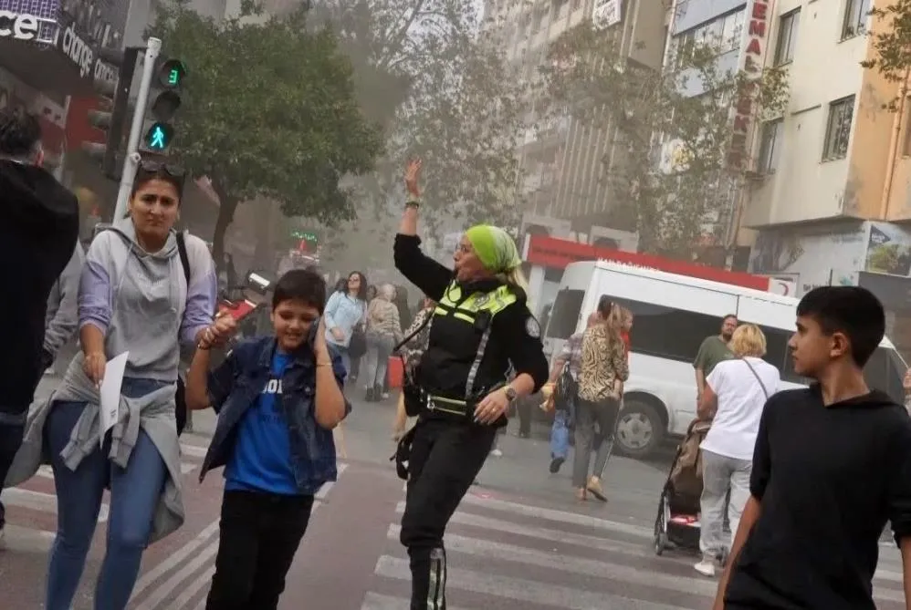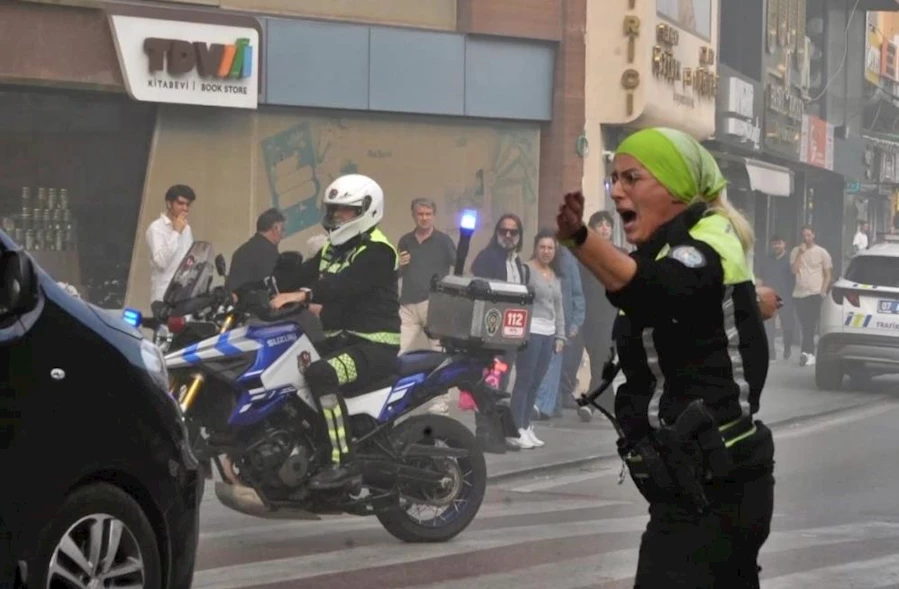Antalya'da yaya ve araç trafiğinin yoğun olduğu caddede bir iş yerinin bacasında çıkan yangında dumanları fark eden kadın trafik polisi, Acil Çağrı Merkezi'ni arayıp, itfaiye ekiplerinin gelmesini hızlandırabilmek için var gücüyle çaba sarf etti. Trafik polisi, yayaları bölgeden uzaklaştırarak, olayları izleyip trafiği yavaşlatan sürücüleri ise ‘Bas gaza, önüne bak' şeklinde uyardı.