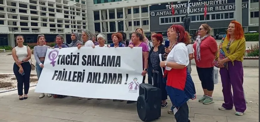 Antalya Kadın Platformu bileşenleri Antalya Büyükşehir Belediyesi önünde bir basın açıklaması yaparak taciz ve şiddet iddialarıyla gündeme gelen belediye çalışanı ve eski Gençlik Meclisi Başkanı O.Ş.K hakkında idareyi gerekeni yapmaya çağırdı.
