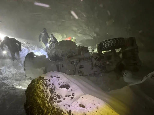 Bu sırada yol açma çalışması yapan N.Ş'nin kullandığı ve içinde 3 vatandaşın bulunduğu İl Özel İdaresine ait kepçe uçuruma yuvarlandı. Bölgeye sevk edilen UMKE, jandarma ile arama kurtarma ekipleri arama çalışması başlattı. İş makinesine ulaşan ekipler, ağır yaralanan iş makinesi operatörü N.Ş'yi sedyeyle yaklaşık 500 metre taşıyarak, paletli ambulansa getirdi.