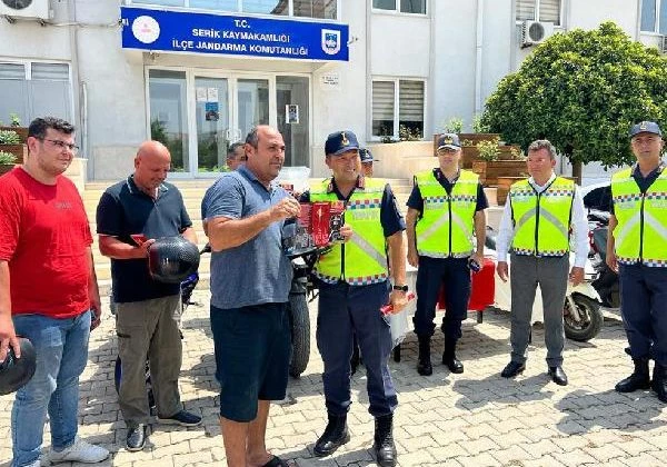 Antalya’nın Serik ilçesinde ‘Kaskımla Güvendeyim’ projesi kapsamında jandarma ekipleri motosiklet sürücülerine sürüş teknikleri hakkında bilgi verdi, kask hediye etti.