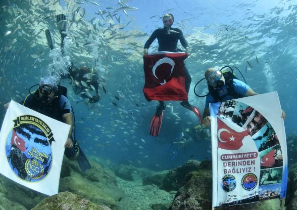 Antalya'nın Kemer ilçesinde, 1917'de Paris 2 ve Aleksandra gemilerini batıran Mustafa Ertuğrul Aker ve askerlerinin Koca Burun mevkisindeki siperlerinin altına dalan dalgıçlar, 'Cumhuriyet'e derinden bağlıyız' yazılı pankart ve Türk bayrağı açtı.