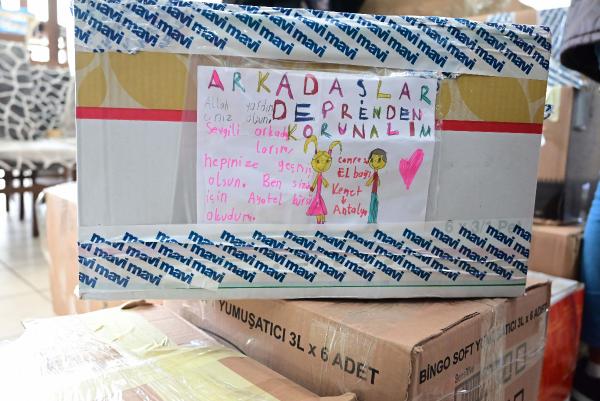 Kemer Belediyesi ve Arslanbucak Düğün Salonu'nda deprem bölgesine gönderilmek üzere toplanan yardım malzemeleri içerisinde gelen mektuplar, çocukların hatıralarıyla dolu oyuncukları görenlerin gözleri doluyor. Deprem bölgesinde çocukları düşünen minik yüreklerden birisi gönderdiği giyeceklerin üzerine 'İhtiyaç giderebilecek olanların kullanılması, kullanılamayacak olanların da ısınmak için yakılması amacıyla kullanın. Sizin yanınızdayız, asla yalnız değilsiniz, Allah yardımcınız olsun' notunu düştü.