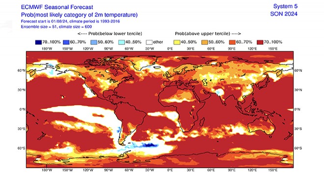 Meteoroloji Genel Müdürlüğü'nün yine ECMWF'nin tahminleri üzerinden uzun vadeli mevsimlik tahmin verilerine göre eylül ayında Türkiye için hava sıcaklığının iç ve güneybatı kesimlerde mevsim normallerinin 1 ila 2 derece üzerinde, diğer yerlerde ise mevsim normallerinin 0,5 ila 1 derece üzerinde seyredeceği bekleniyor. Yağışın da yurt genelinde mevsim normalleri civarında gerçekleşeceği öngörülüyor.