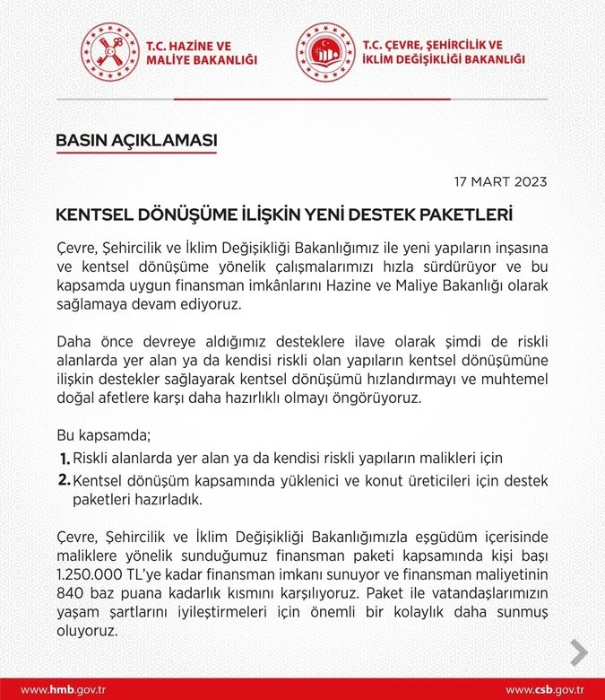 Müteahhide teşvik, vatandaşa büyük ödeme kolaylığı ile binaların dönüşümü gerçekleşecek. Çevre, Şehircilik ve İklim Değişikliği Murat Kurum, resmî sosyal medya hesabından yayımladığı mesajla, Çevre, Şehircilik ve İklim Değişikliği Bakanlığı ve Hazine ve Maliye Bakanlığı eşgüdümü içerisinde maliklere yönelik sunulan finansman paketini açıkladı. Buna göre kentsel dönüşüm kredisinde limit 600 binden 1 milyon 250 bin TL'ye çıktı. Öte yandan Hazine ve Maliye Bakanlığı'nın bugün özel bankalarla da kentsel dönüşüm kredi paketi için görüşme yapacağı açıklandı.