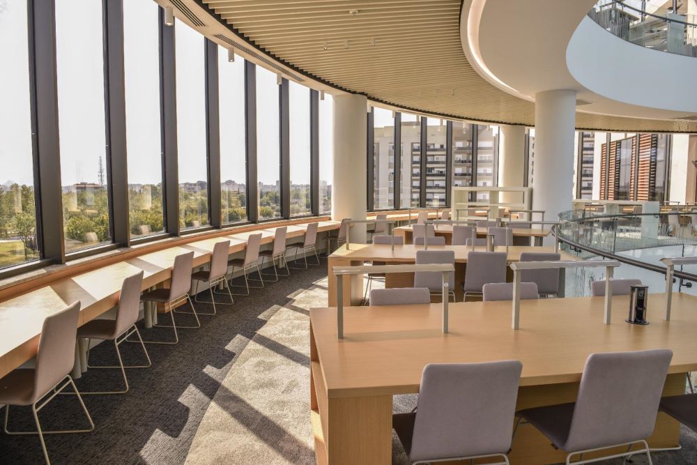 Bey Dağları ve Akdeniz manzaralı Kütüphanenin üç katında ergonomik mobilyalarla, verimliği arttıracak ışık kullanımıyla çalışma alanları oluşturuldu. Kültürel tesisin en üst katında bulunan araştırma salonu ise akademik çalışma yapacak olan ziyaretçiler için tasarlandı.