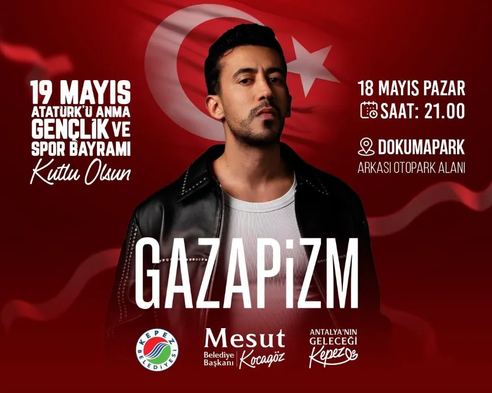 Kepez Belediyesi, 19 Mayıs Atatürk’ü Anma, Gençlik ve Spor Bayramı dolayısıyla gençlere özel dopdolu bir etkinlik programı hazırladı. Bu kapsamda, Türk rap müziğinin sevilen isimlerinden Gazapizm, 18 Mayıs Pazar akşamı Kepezli gençlerle buluşacak. Konser, saat 21.00’de Dokumapark arkasındaki otopark alanında gerçekleştirilecek. Belediye tarafından düzenlenen etkinlikte, gençler bayram coşkusunu doyasıya yaşayacak.