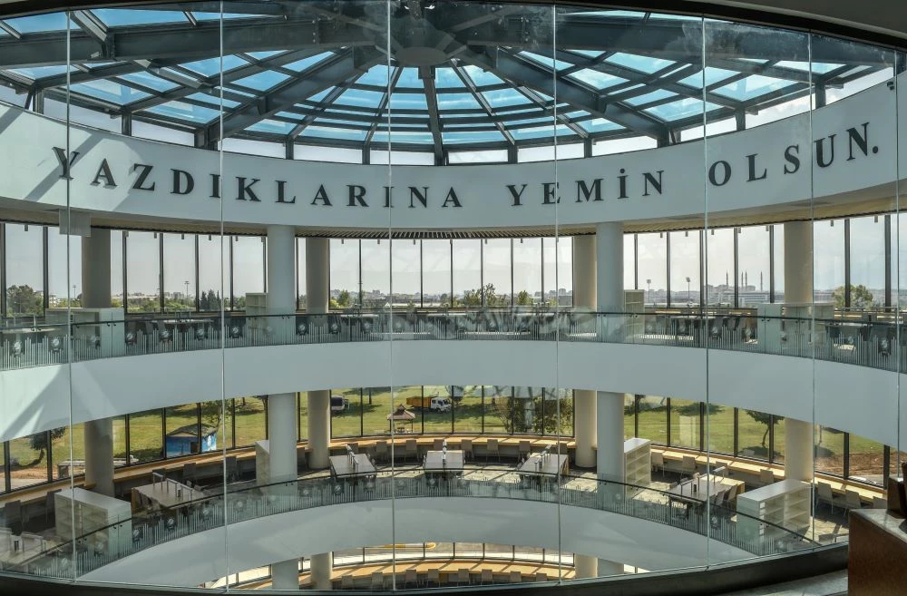 Antalya Kütüphanesi, her açıdan düşünülerek tasarlanmış muazzam bir kütüphane… Mimari tasarımı, doğal ışığın kullanılması dikkate alınarak planlandı. Kitabın, okumanın, bilginin önemine dikkat çekmek amacıyla da kütüphanenin cam kubbeli tavanına Kalem suresinin ‘Kaleme ve onun satır satır yazdıklarına yemin olsun.’ ayeti yazıldı.