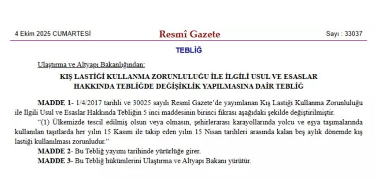 Ulaştırma ve Altyapı Bakanlığı tarafından Resmi Gazete’de yayımlanan tebliğe göre, kış lastiği zorunluluğu uygulamasında tarihler değiştirildi. Önceki yıllarda 1 Aralık-1 Nisan tarihleri arasında geçerli olan uygulama, bu yıldan itibaren 15 Kasım-15 Nisan tarihleri arasında geçerli olacak. Yeni düzenlemeyle birlikte, kış lastiği kullanım süresi 4 aydan 5 aya uzatıldı. Türkiye’de tescilli olsun ya da olmasın, şehirlerarası karayollarında yük ve yolcu taşımacılığı yapan tüm araçlar için bu tarihler arasında kış lastiği kullanımı yasal zorunluluk haline geldi.