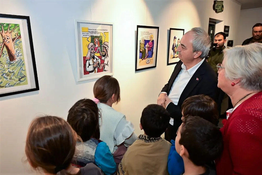 Açılış konuşmasından sonra Başkan Kocagöz, çocuklarla sergiyi gezdi. Feride Özşakacı da, sergilenen karikatürlerle ilgili bilgi verdi.