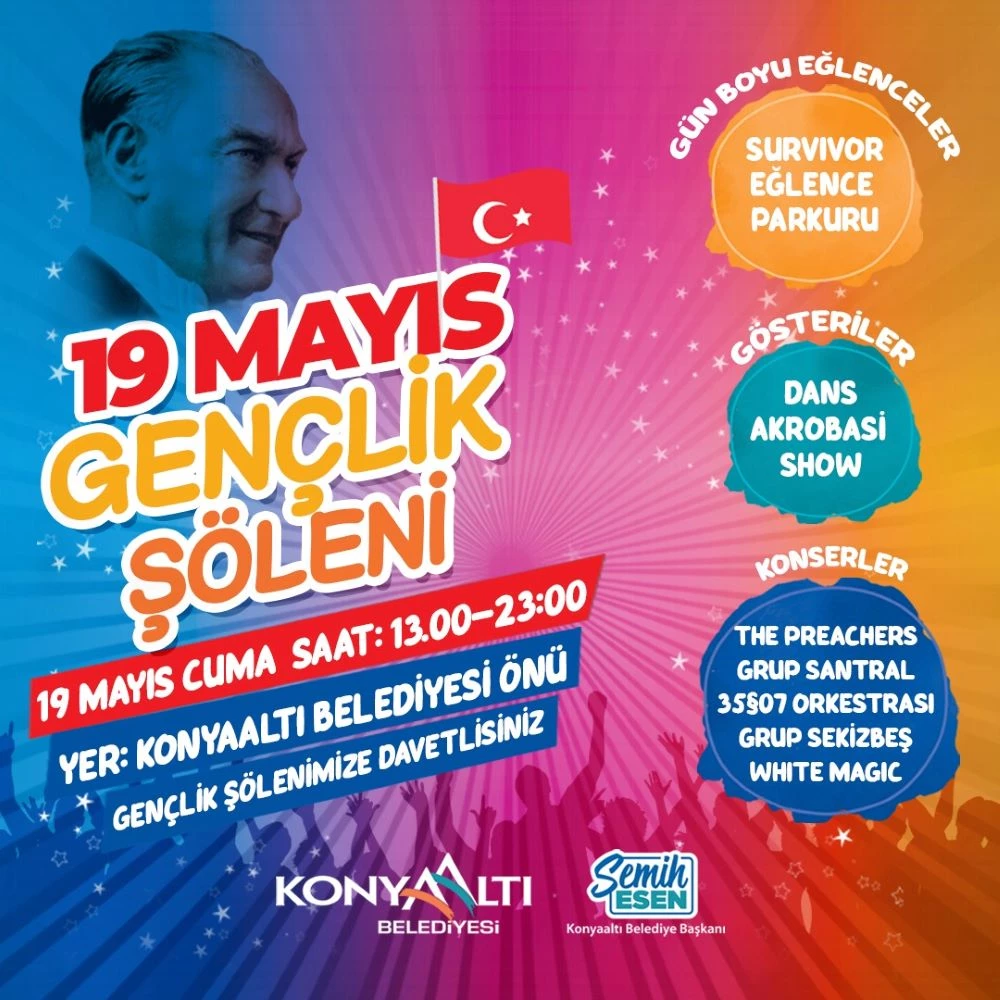 Konyaaltı Belediyesi, her yıl olduğu gibi bu yıl da 19 Mayıs Atatürk’ü Anma Gençlik ve Spor Bayramı’nı, hazırladığı bir dizi etkinlikle kutlayacak. 19 Mayıs Cuma günü saat 13:00’te Belediye Hizmet Binası önünde Dj Performansı ile başlayacak etkinlikler, gün boyunca her yaştan vatandaş için etkinlik ve konserlerle devam edecek. Saat 14:00’te Lb Club Dance Sahne Senin, Show Sotp Dance ve Chi Studio Grup, Antalya Tango Dans Okulu’nun sahne alacağı etkinlikler, 15:45’te The Preachers konseriyle 19 Mayıs coşkusunu sürdürecek. Brezilya Dans Gösterisi ve Antalya Sirk Okulu, 35x07 Orkestrası ve Africa Akrobasi Gösterisi performansları da gündüz bölümünde vatandaşla buluşacak.