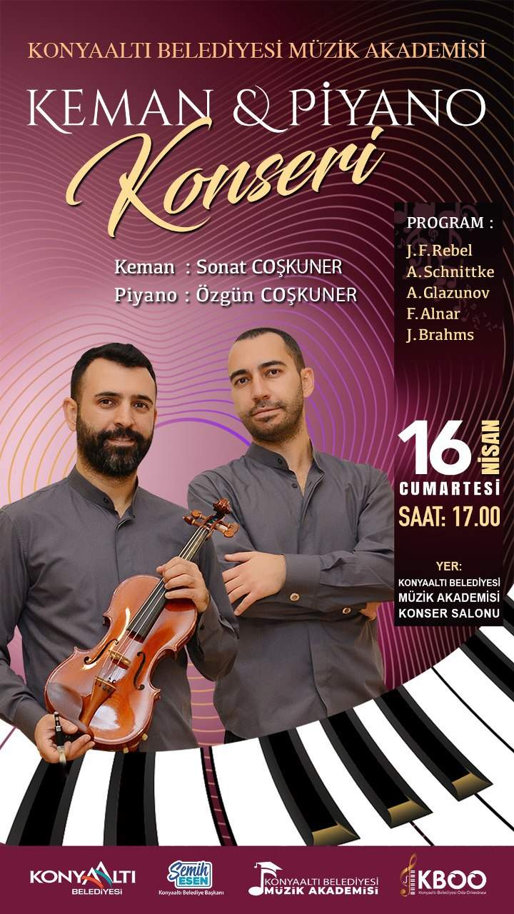 Konyaaltı Belediyesi’nin düzenleyeceği diğer bir etkinlik ise Müzik Akademisi Keman & Piyano Konseri olacak. Keman’da Sonat Coşkuner ve Piyano’da Özgün Coşkuner’in yer alacağı konser 16 Nisan Cumartesi saat 17.00’de Konyaaltı Belediyesi Müzik Akademisi Konser Salonu’nda gerçekleştirilecek.