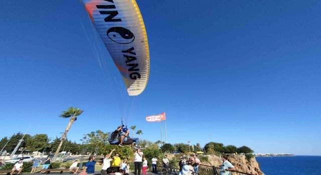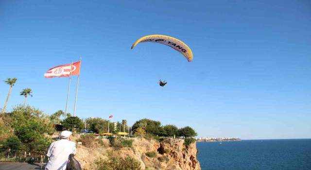 Turizm kenti Antalya’nın dünyaca ünlü Konyaaltı Sahili’nde hafta sonu yoğunluğu oluştu. Ambulans ve sahil güvenlik helikopter güzergahı olması nedeniyle uçuşa yasak olan varyant falezler üzerindeki yamaç paraşütçüleri de dikkati çekti.
