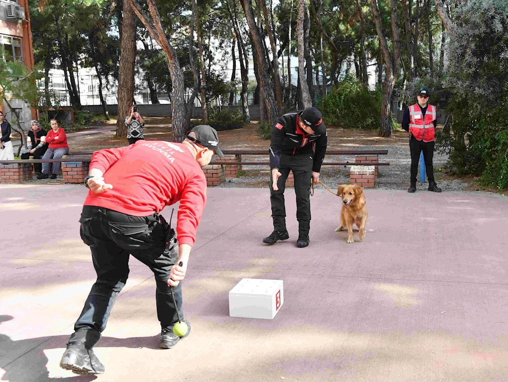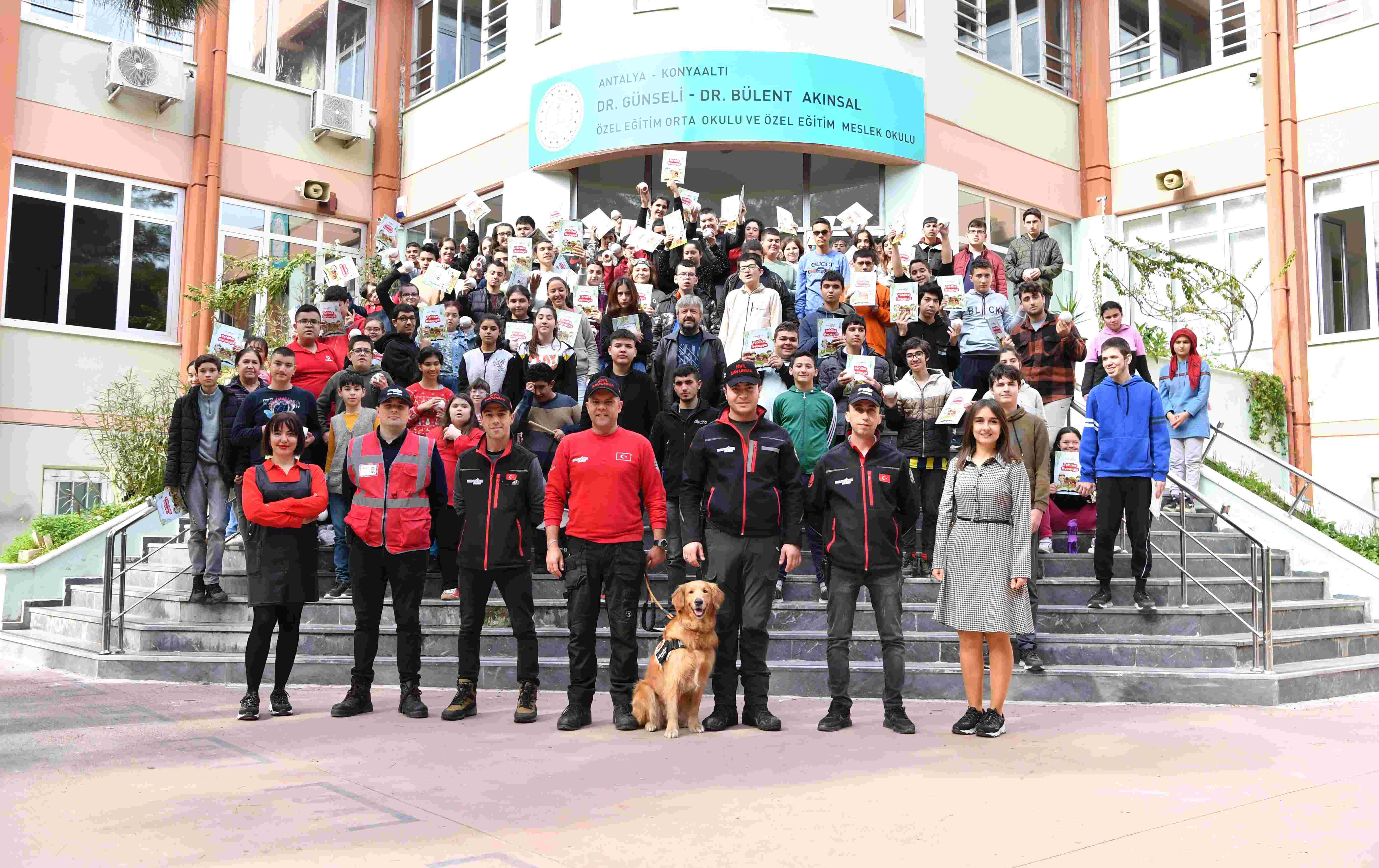 Konyaaltı Belediyesi Destek Hizmetleri Sivil Savunma Ekipleri, Deprem Haftası nedeniyle Dr. Günseli Dr. Bülent Akınsal Özel Eğitim Ortaokulu ve Özel Eğitim Meslek Okulu’nda özel öğrencilere acil durum eğitimi ve deprem tatbikatı gerçekleştirdi. Konyaaltı Belediyesi arama kurtarma köpeği Zeyna’nın da katıldığı tatbikatta özel öğrenciler hem eğlendi hem de öğrendi.