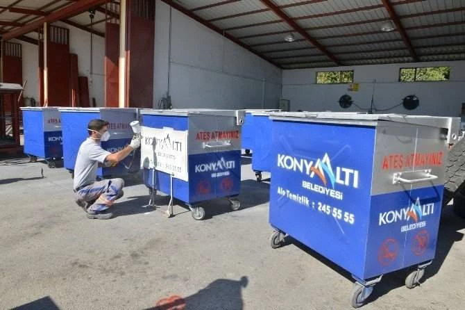 Konyaaltı Belediyesi, ilçedeki evsel atıkların toplanması amacıyla kullanılan çöp ve geri dönüşüm konteynerlerini Temizlik İşleri Müdürlüğü bünyesinde kurulan atölyede üretiyor. Belediye, piyasanın yarı fiyatına yaptığı imalat ile bu alandaki giderlerini yüzde 50 oranında azalttı. Ayrıca, çeşitli sebeplerle zarar gören konteynerler de aynı atölyede tamir edilerek yeniden kullanıma sunuluyor.