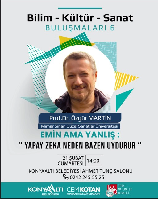 Konyaaltı Belediyesi’nin 6’ncısını düzenlediği Bilim, Kültür ve Sanat Buluşmaları kapsamında Prof. Dr. Özgür Martin, “Yapay Zeka Neden Bazen Uydurur” başlıklı konferansla katılımcılarla bir araya gelecek. Etkinlik, 21 Şubat Cumartesi günü saat 14.00’te Konyaaltı Belediyesi Ahmet Tunç Salonu’nda gerçekleştirilecek.