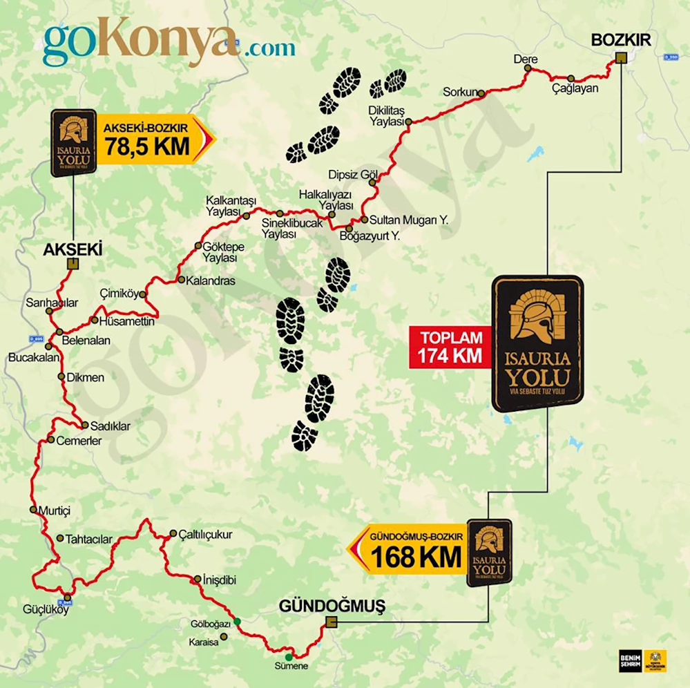 Konya Büyükşehir Belediyesi tarafından bölge turizmine kazandırılan 174 kilometre uzunluğundaki Isauria Yolu’nun doğa yürüyüşçüleri tarafından kolayca yürünebilmesi amacıyla “Isauria Yolu Rota Kılavuzu” kitabı yayınlandı. Torosların içinden Konya Bozkır’dan başlayıp Antalya Akseki’ye uzanan ve Antalya’nın Gündoğmuş ilçe merkezinde biten yürüyüş yolu tarihle ve doğayla iç içe bir deneyim sunuyor.174 kilometre uzunluğunda: Konya’da başlayıp Antalya’da bitiyor! İşte, Türkiye’nin yeni yürüyüş rotası