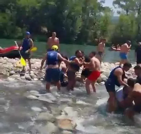 Antalya’da su sporları merkezinde can yeleği giymeyen bir grup ile kendilerini yelek giymeleri konusunda uyaran grup arasında kavga çıktı. Suyun içinde yaşanan kavgada tekme ve yumrukların yanı sıra rafting kürekleri de kullanıldı.