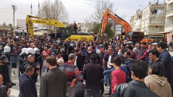 AK Parti İlçe Başkanı Kemal Sancaktar ve bazı meclis üyeleri iş makinesinin üzerine çıkarak, yıkım kararına tepki gösterdi. Pazar alanında toplananların dağılmaması üzerine polis, müdahale etti. Kalkanlarla pazarcıları dağıtmaya çalışan polis, müdahele sırasında biber gazı kullandı. Yıkıma karşı çıkan pazarcılardan biri fenalaştı. Bunun üzerine partililerin ve vatandaşların tepkisiyle polis müdaheleyi sonlandırdı. Biber gazından fenalaşan pazarcıya sağlık ekipleri kontrol ederek, hastaneye götürdü. Hafif etkilenenlere de çevredekiler yardım etti.