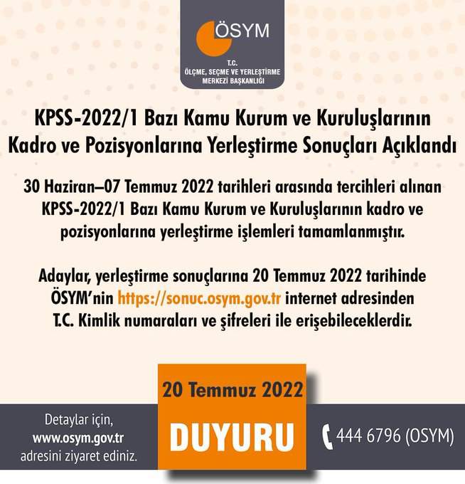 Adaylar, yerleştirme sonuçlarına 20 Temmuz 2022 tarihinde ÖSYM'nin https://sonuc.osym.gov.tr internet adresinden T.C. Kimlik numaraları ve şifreleri ile erişebileceklerdir.'