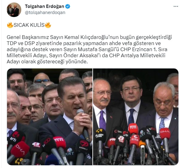 “Genel Başkanımız Sayın Kemal Kılıçdaroğlu’nun bugün gerçekleştirdiği TDP ve DSP ziyaretinde pazarlık yapmadan ahde vefa gösteren ve adaylığına destek veren Sayın Mustafa Sarıgül’ü CHP Erzincan 1. Sıra Milletvekili Adayı, Sayın Önder Aksakal’ı da CHP Antalya Milletvekili Adayı olarak göstereceği yönünde.”