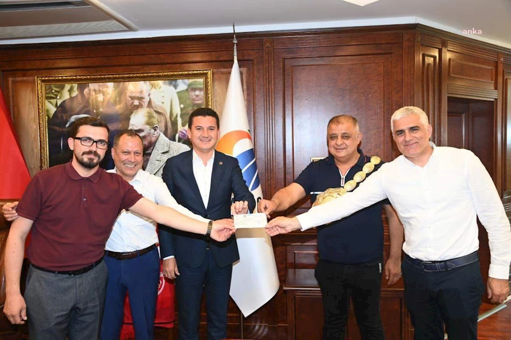 Kumluca Belediye Başkanı Mustafa Köleoğlu, çeki teslime gelen Niyazi Çiftçi 'ye altın ağalık kemerini takdim etti.