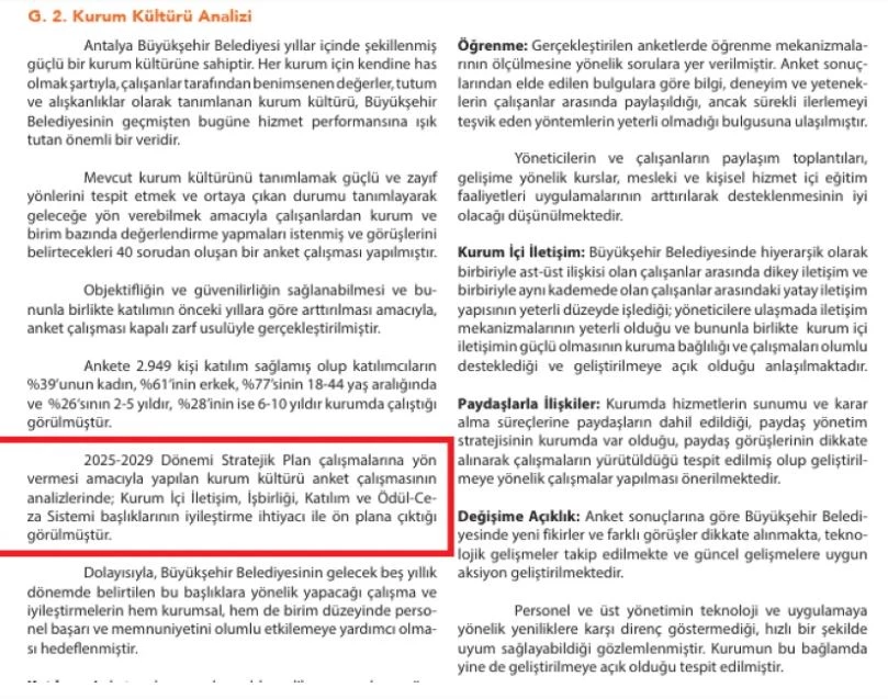 Antalya Büyükşehir Belediyesi'nin 5 yıllık hedef ve projelerinin yer aldığı Stratejik Plan Raporu’nda ‘Kurum Kültürü Analizi’ başlığı altında yer verilen ankete, belediyede görev yapan 2949 personelin katılım sağladığı belirtilerek şöyle denildi: “Antalya Büyükşehir Belediyesi, yıllar içinde şekillenmiş güçlü bir kurum kültürüne sahiptir. Her kurum için kendine has olmak şartıyla, çalışanlar tarafından benimsenen değerler, tutum ve alışkanlıklar olarak tanımlanan kurum kültürü, Büyükşehir Belediyesinin geçmişten bugüne hizmet performansına ışık tutan önemli bir veridir. Mevcut kurum kültürünü tanımlamak güçlü ve zayıf yönlerini tespit etmek ve ortaya çıkan durumu tanımlayarak geleceğe yön verebilmek amacıyla çalışanlardan kurum ve birim bazında değerlendirme yapmaları istenmiş ve görüşlerini belirtecekleri 40 sorudan oluşan bir anket çalışması yapılmıştır.”
