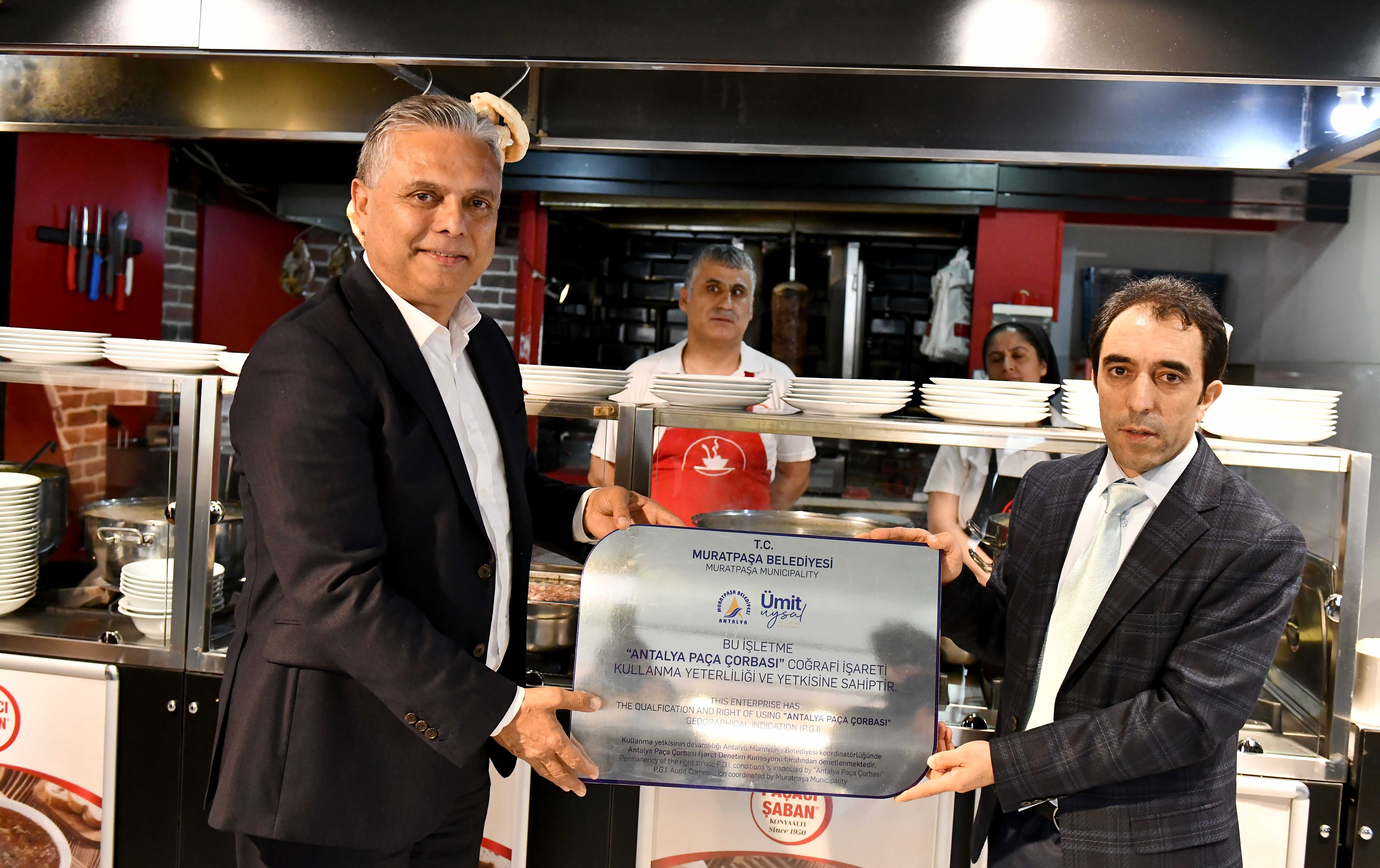 Muratpaşa Belediye Başkanı Ümit Uysal, 'Antalya Paça Çorbası'nın coğrafi işaret belgesini Paçacı Şaban’ın sahibi İsmail Çardaklı ve Paçacı Şemsi’nin sahibi Bekir Tek’e verdi.