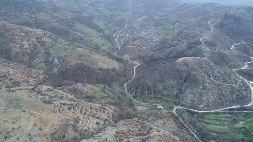 Bölgedeki yanan alanlar ve ağaçlandırma çalışmaları dron ile görüntülendi. Kızılçam fidanlarının ise boylarının 1 karışı aştığı görüldü.