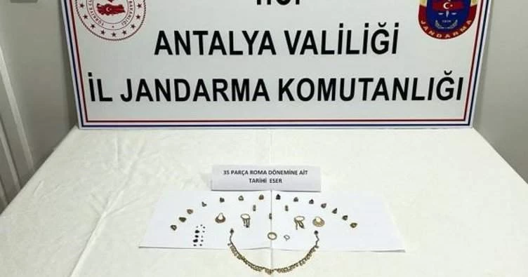 Manavgat İlçe Jandarma Komutanlığı Manavgat Kaçakçılık ve Organize Suçlarla Mücadele Timi ve Çolaklı Jandarma Karakol Komutanlığı ekipleri tarafından Manavgat Cumhuriyet Başsavcılığı koordinesinde gerçekleştirilen operasyonla tarihi eser kaçakçılığı yapacağı belirlenen A.Y. ve R.G. isimli şahıslar yakalandı. Yapılan aramada Roma Dönemine ait olduğu değerlendirilen piyasa değeri yaklaşık 10 milyon TL olan; 14 parça altın kalp ve yaprak şeklinde kolye ucu, 3 parça taşlı altın kolye ucu, 2 parça hilal şeklinde altın küpe, 2 parça püsküllü altın küpe, 1 parça altın hızma, 1 parça altın alyans, 1 parça altın çocuk kolyesi ve 11 parça yakut olmak üzere toplamda 35 parça tarihi esere ele geçirildi.