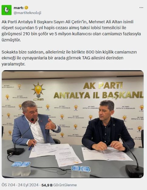 “Ak Parti Antalya İl Başkanı Sayın Ali Çetin’in, Mehmet Ali Altan isimli rüşvet suçundan 5 yıl hapis cezası almış taksi lobisi temsilcisi ile görüşmesi 210 bin şoför ve 5 milyon kullanıcısı olan camiamızı fazlasıyla üzmüştür. Sokakta bize saldıran, ailelerimiz ile birlikte 800 bin kişilik camiamızın ekmeği ile oynayanlarla bir arada görmek TAG ailesini derinden yaralamıştır.”