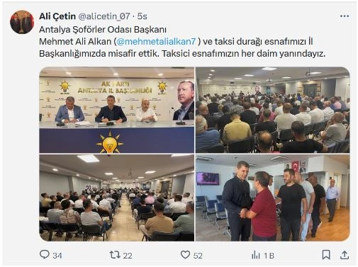 Antalya Şoförler Odası Başkanı Alkan ile görüştükten sonra sosyal medya hesabından paylaşım yapan Ak Parti Antalya İl Başkanı Ali Çetin ise ‘Taksici esnafımızın her daim arkasındayız’ ifadesini kullandı.