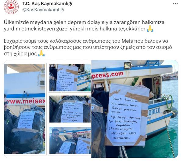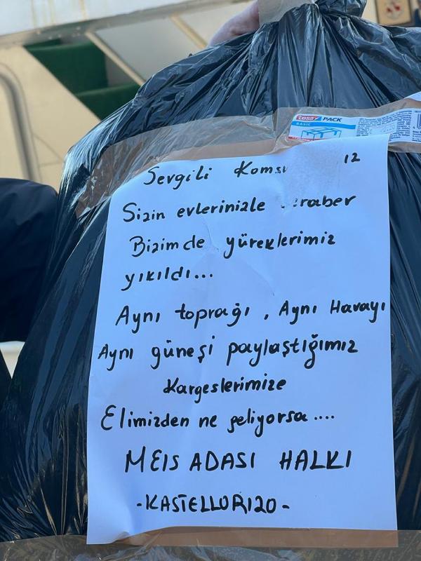 Antalya'nın Kaş ilçesine 7,5 kilometre uzaklıktaki Yunanistan adası Meis'ten, depremzedelere destek için yardım malzemeleri gönderildi. Yardım kolilerinin üzerinde 'Sevgili komşu. Sizin evlerinizle beraber bizim de yüreklerimiz yıkıldı' notu yer aldı.
