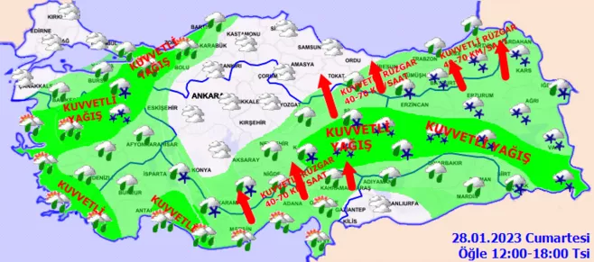 Yağışların; Kıyı Ege, Antalya'nın doğusu, Manisa, Kocaeli, Sakarya, Düzce, Zonguldak ve Bartın çevrelerinde kuvvetli yağmur ve sağanak, Bilecik, Kayseri, Sivas, Malatya, Tunceli, Elazığ, Bingöl, Muş, Hakkari ve Bitlis çevrelerinde kuvvetli ve yer yer yoğun kar şeklinde olması beklendiğinden yaşanabilecek olumsuzluklara karşı dikkatli ve tedbirli olunması gerekmektedir.