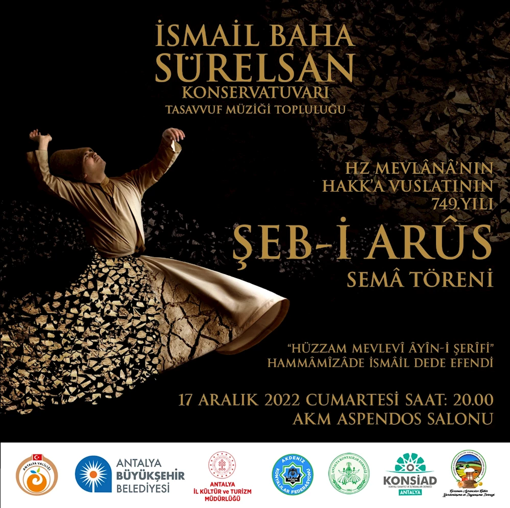 Mevlânâ Celâleddin-i Rûmî Hakk’a vuslatının 749’ncu yıldönümünde Antalya’da Semâ Töreni ile anılacak. Antalya Büyükşehir Belediyesi Kültür ve Sosyal İşler Daire Başkanlığı Antalya Valiliği, İl Kültür ve Turizm Müdürlüğü, Akdeniz Konyalılar Federasyonu, Antalya Konyalılar Derneği, Konyalı Sanayici ve İş İnsanları Derneği Antalya Şubesi, Karaman Ayrancılar Kültür Yardımlaşma ve Dayanışma Derneği işbirliğiyle düzenlenecek Sema Töreni 17 Aralık Cumartesi günü saat 20.00’de AKM Aspendos Salonu’nda gerçekleştirilecek. Mevlânâ’yı anma etkinliğinde her yıl olduğu gibi bu yıl da Antalya Büyükşehir Belediyesi İsmail Baha Sürelsan Konservatuvarı Tasavvuf Müziği Topluluğu sahne alacak. /VARIŞ HABER