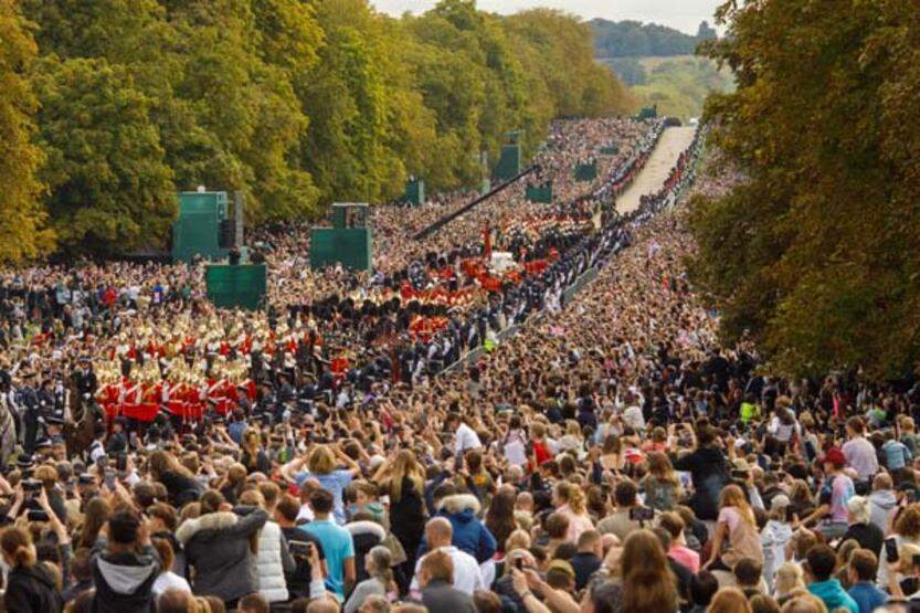 Devlet top arabasının taşıdığı Kraliçe’nin tabutunun arkasında, Kral Charles ve diğer kraliyet ailesi üyeleri yürüyüşe eşlik etti. Parlamento binasındaki saat kulesi olan Big Ben’de, bu rotadaki yürüyüş sırasında çanlar çaldı. Hyde Park’ta da her dakika başında top atışı yapıldı. Asker ve polisin hazır beklediği bu rota üzerinde, halk da resmi geçidi izledi. Tarihi töreni yakından izlemek isteyen bazı vatandaşlar, geceden belirli bölgelerde sıra kapmak için sabahladı.